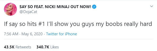 «Если Say So попадет на первое место, ребята, я покажу вам свою грудь», — написала исполнительница в твиттере. С момента публикации пост Doja Cat набрал 339 тысяч лайков и 43,5 тысячи ретвитов.