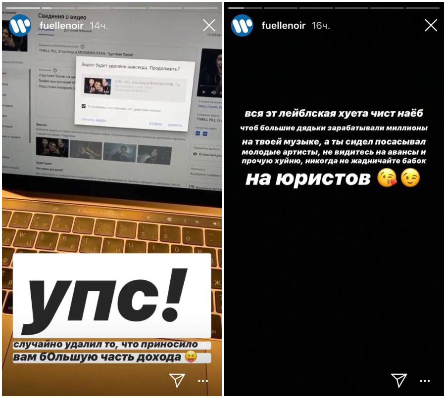 Как оказалось, причиной такого решения стал конфликт рэпера с лейблом Warner Music. «Упс! Случайно удалил то, что приносило вам большую часть дохода», — написал Thrill Pill в сторис. После чего он прокомментировал ситуацию и дал совет другим молодым аристам: