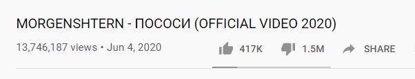 Morgenshtern призвал дизлайкать собственный клип «Поссои» после того, как аудитория принялась и без того сделала его самым негативно оцененным видео на его канале. Рэпер быстро сообразил и поставил фанатам условия — если антирекорд Тимати и Гуфа будет побит, он выложит тот самый трек «Cadillac». Ждать долго не пришлось, и сейчас у «Пососи» уже 1,5 миллиона «пальцев вниз».
