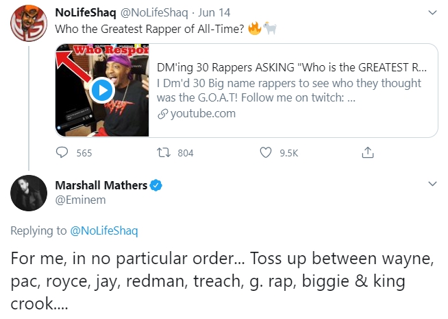 Eminem ответил популярному YouTube-блогеру NoLifeShaq, который написал в личку многим артистам и задал им вопрос о величайшем рэпере всех времен. Несмотря на то, что Маршалл не ответил на его сообщение, рэпер опубликовал свой список в твиттере (и позже добавил еще ряд имен).