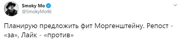 Смоки Мо в своем твиттере сообщил, что собирается предложить фит «Моргенштейну» — в виду, разумеется, имелся Моргенштерн. Люди, которые поддерживают это решение, должны лайкнуть твит Смоки, те же, кто против — должны ретвитнуть запись.