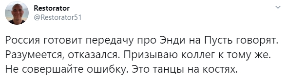 Сегодня Ресторатор опубликовал в твиттере сообщение, в котором рассказал, что «Россия» готовит передачу про Энди Картрайта. Будет ли это «Пусть говорят» или другое шоу, он не уточнил, но призвал всех коллег не соглашаться на участие.