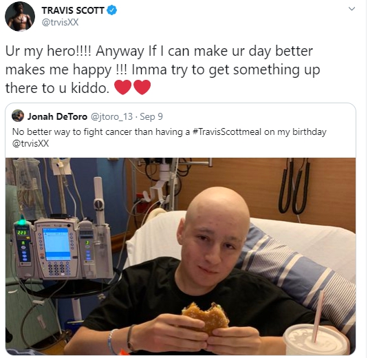 Travis Scott обратил внимание на пост мальчика по имени Джона ДеТоро. «Лучший способ бороться с раком — съесть комбо от Трэвиса Скотта в свой день рождения», — написал парень, сфотографировавшись с обедом из Макдоналдса.