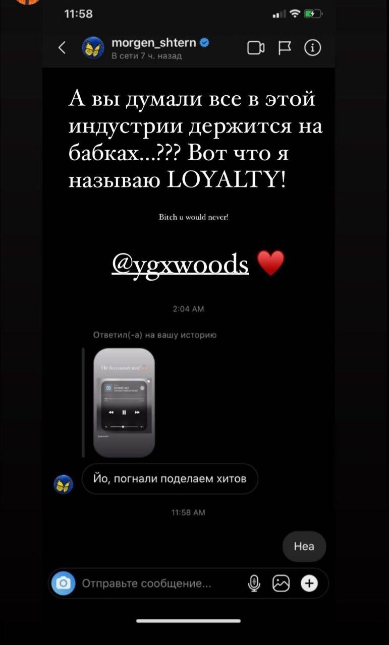 Как выяснилось, Morgenshtern написал битмейкеру YG Woods, который сотрудничает с Kizaru, и предложил «наделать хитов». Тот отказался немногословным «неа», эту информацию подхватил Kizaru: «вы думали, в этой индустрии все на бабках держится»?