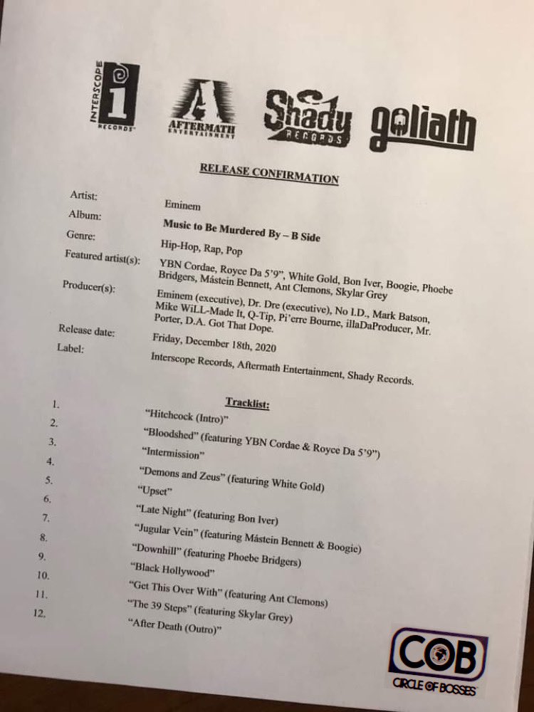Возможно, Маршалл тоже не устоял перед трендом на делюкс-издания успешных релизов. В сети появилось фото с предполагаемым треклистом проекта «Music To Be Murdered By — B Side».