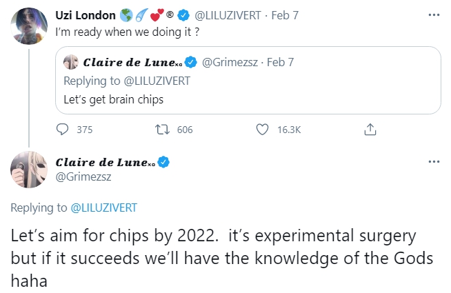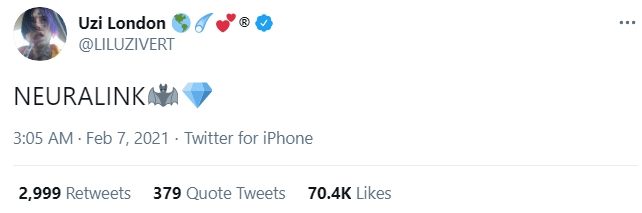 Все началось с твита рэпера, в котором он просто написал название стартапа Илона Маска Neuralink. Вскоре на сообщение Lil Uzi Vert отреагировала Grimes, написав: «Давай вставим чипы в мозг».