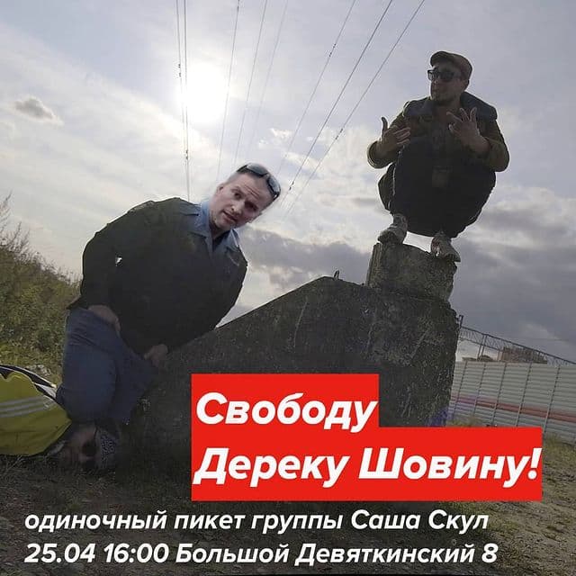 Саша Скул вышел на одиночный пикет «Свободу Дереку Шовину», приковав себя к ограде посольства США в Москве.