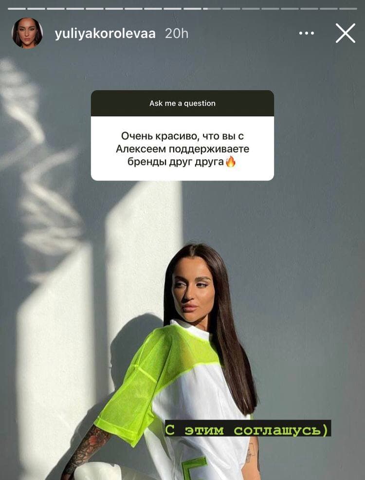 При этом Королева еще вчера отвечала подписчикам, что рада тому, что она и Алексей поддерживают бренды друг друга.