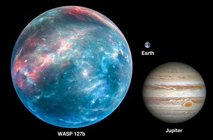На фото изображена планета WASP-127b. Это газовый гигант, радиус которого в 1,4 раза превышает радиус Юпитера. Экзопланета вращается вокруг желтого карлика, похожего на наше солнце.