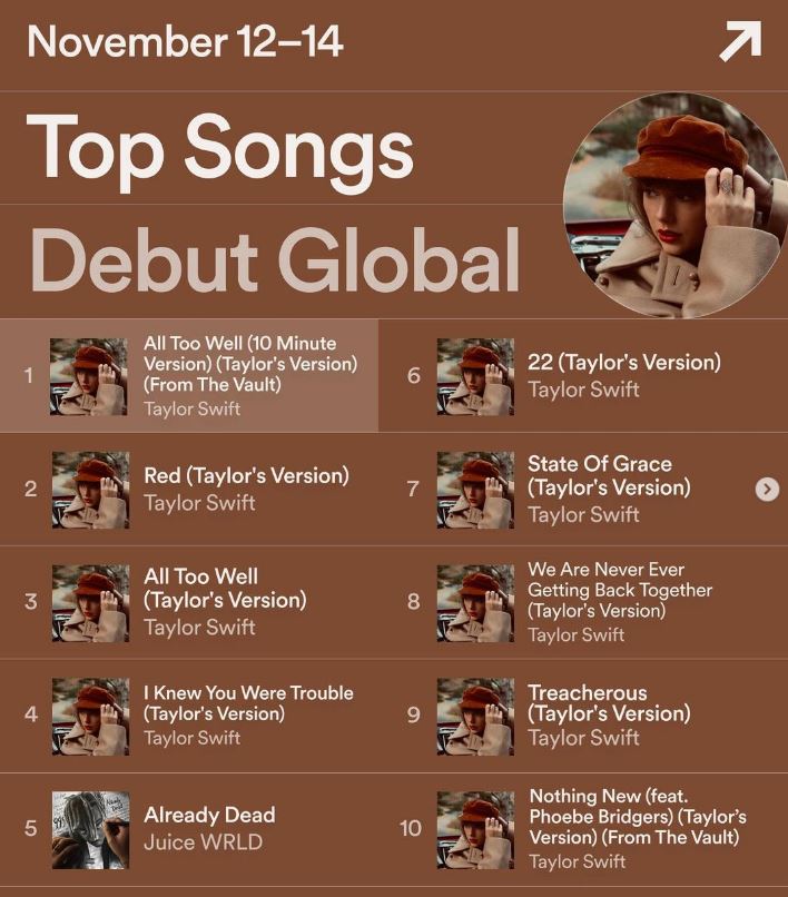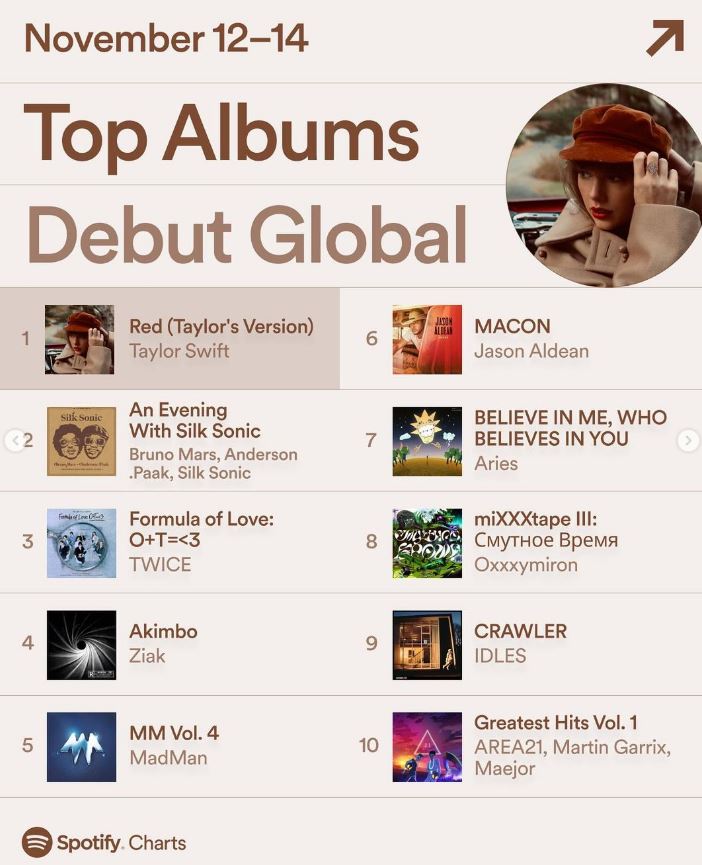 В начале текущей недели Spotify отрапортовал о самых популярных релизах минувших выходных. В прошлую пятницу состоялось несколько очень громких премьер: например, выпустила альбом Тэйлор Свифт, отметились альбомом Silk Sonic (дуэт Бруно Марса и Андерсона Паака). Эти две пластинки и заняли соответственно первое и второе места.