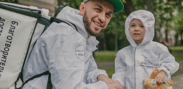 В рамках благотворительной доставки волонтёры, которыми зачастую становятся и медийные личности, обеспечивают одиноких пенсионеров и людей с инвалидностью горячими обедами.