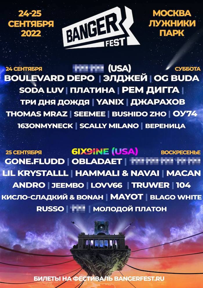 24.09 - Громкое мероприятие так и не состоялось. Связано это с последними новостями в стране или нет - пока не известно. Организаторы уверяли, что 6ix9ine все же выступит — это будет сольное шоу и обещают, что билеты на 24-25 сентября будут действовать.