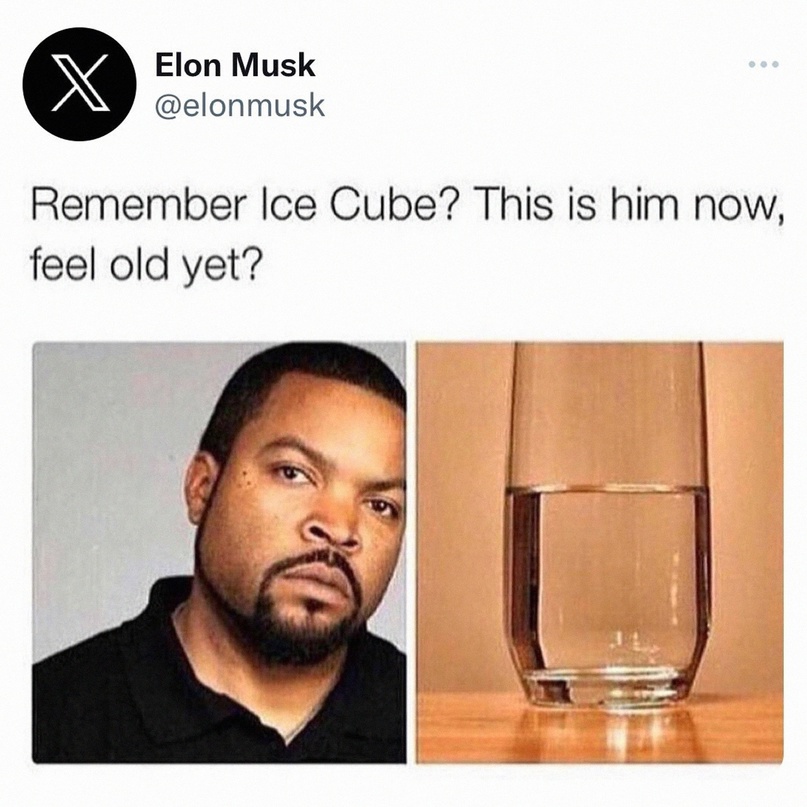 С чего-то вдруг, Илон Маск вспомнил про рэппера Ice Cube, чье имя можно перевести на русский, как "Кубик льда". Взяв за основу изначальный смысл этих слов, знаменитый бизнесмен опубликовал мемас с прилагающейся картинкой у себя в твиттере: