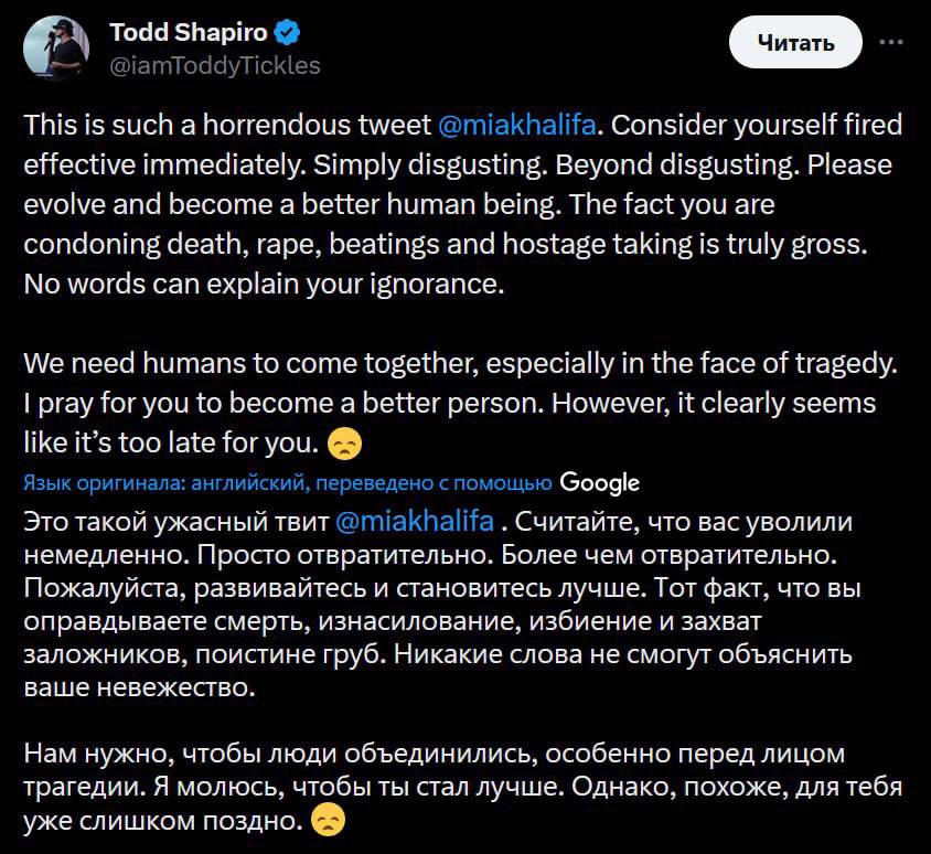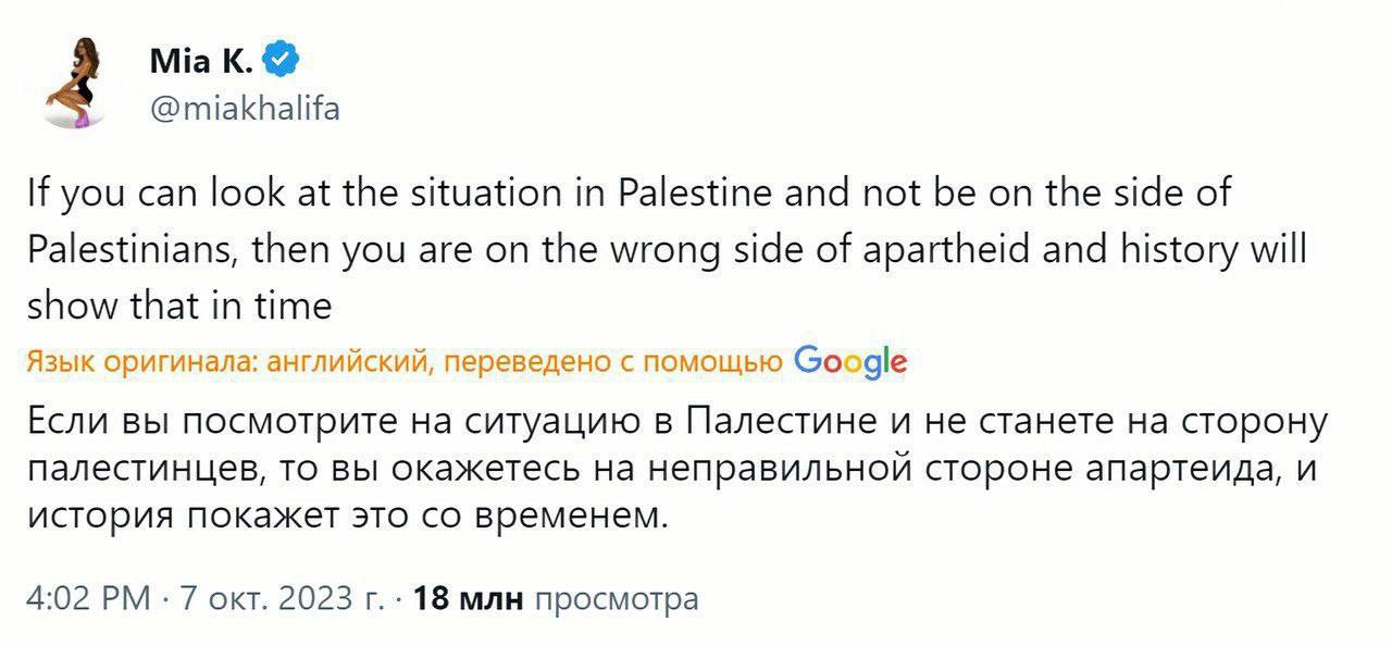 Playboy разорвал сотрудничество Мией Халифой (ливанская порноактриса) из-за поддержки Палестины.