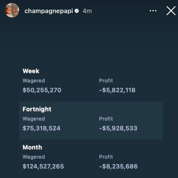 Теперь похоже, что Дрейк тратит эти деньги на тот самый продукт, который рекламирует. В сторис (на втором слайде) Дрейк недавно рассказал, что за последний месяц он поставил почти $125 миллионов и проиграл более восьми.