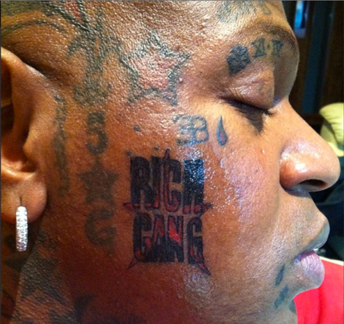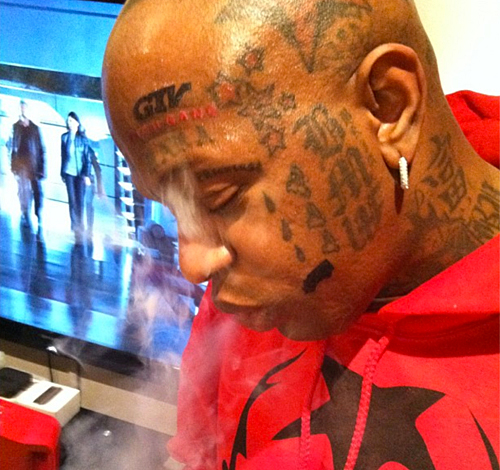 Свежее фото из его инстраграма свидетельствует — на лбу рэпера появилась реклама GTV (это его марка водки Grand Touring Vodka), а на щеке — лого компании одежды Trukfit, которой заведует Lil Wayne.