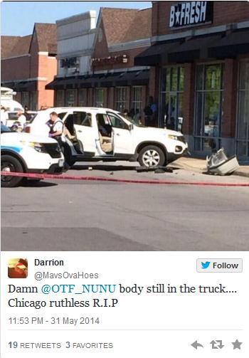 Сначала Lil Jojo, потом Blood Money, теперь OTF Nunu. Кузен быстро набирающего популярность исполнителя в жанре дрилл Lil Durk, 21-летний OTF Nunu, был найден мёртвым около торгового центра в родном городе. Едва попав на радары блогов и музыкальных журналов и анонсировав дебютный проект «Nuski Got Da Strap», Nunu не успел раскрыть потенциал в полной мере. В то время как рэпер находился в автомобиле на парковке около «Chatham Village Square Mall», к нему подъехали неизвестные люди и открыли огонь. Пытаясь скрыться с места происшествия, Nunu врезался в переднее стекло магазина. Как видно на фотографиях, он так и не сумел выбраться из машины. Друзья артиста выражают соболезнования в «Twitter» с самого утра.