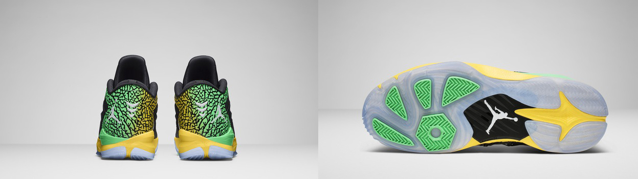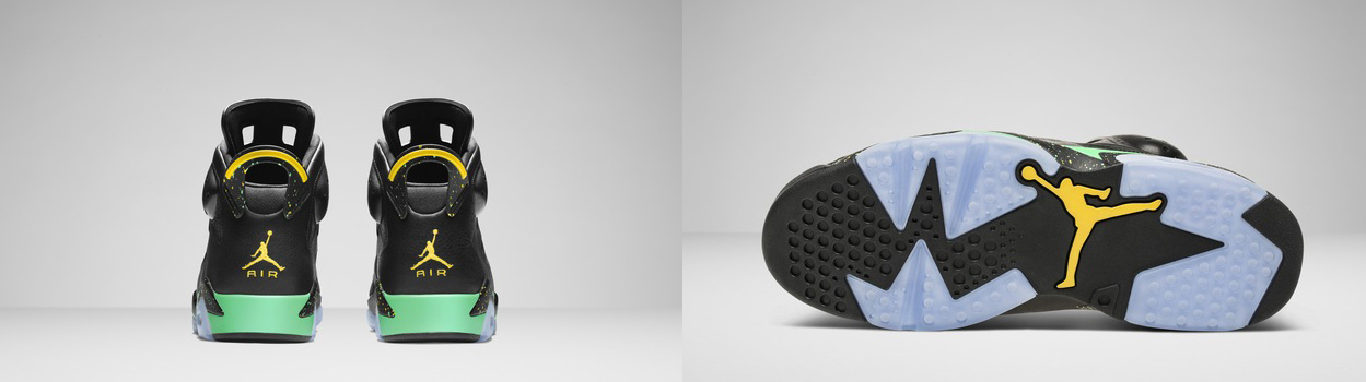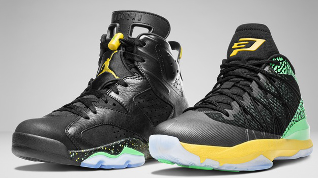 Расцветка обуви "Brazil Pack" была создана исходя из цветовой гаммы Бразильского флага. Согласитесь, яркие оттенки зеленого и желтого прекрасно вписываются в приятный темный цвет кроссовок Air Jordan VI и CP3.VII AE.