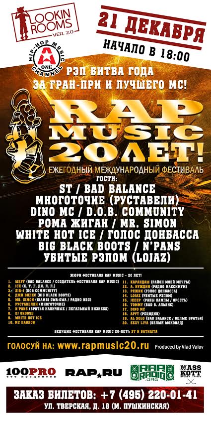 21 декабря 2014 года состоится двадцатый ежегодный фестиваль Влада Валова «Rap Music». Его участниками когда-то были Каста, Многоточие, Смоки Мо, Карандаш, Триада и многие другие. Местом встречи станет клуб «Lookin Rooms», находящийся в центре Москвы.
