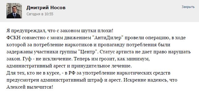Товарищу суд постановил лечение, а этот человек не лечился. Это уже нарушение. Кроме того, была проведена экспертиза его деятельности, и было заключение, что это — пропаганда наркотиков. Не знаю, где конкретно. Поверьте мне, у меня и так много других дел помимо того, чтобы заниматься Гуфом. Это вообще делал не «Антидилер», мы просто помогали сотрудникам ФСКН. Жалоба о пропаганде наркотиков несколько раз отсылалась в Москву, но там говорили, что суд должен быть по месту преступления.