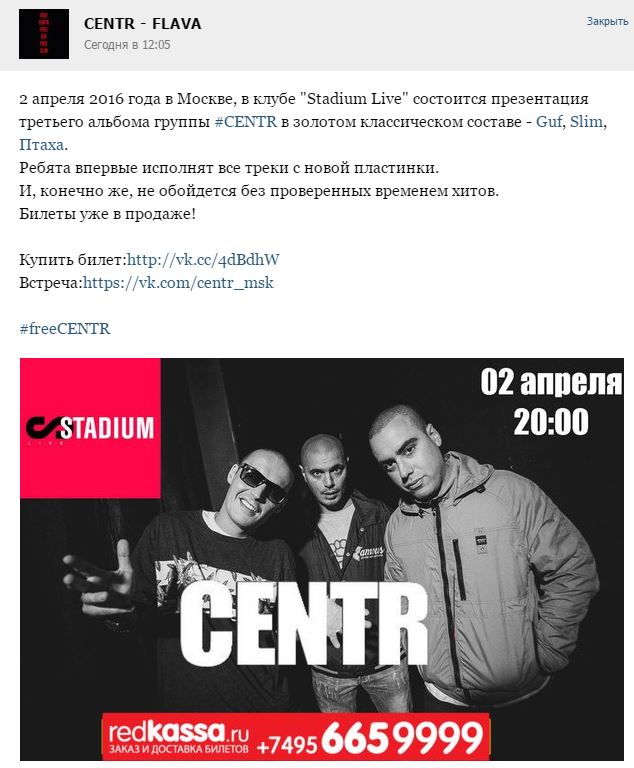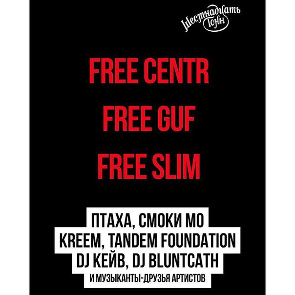 Обновлено: сегодняшний концерт в клубе Шестнадцать тонн не отменяется. На сцене будут Птаха, Смоки Мо, TAHDEM Foundation, другие друзья CENTR'a. Птаха в инстаграме отметил: «Имена не палим потому что приедут все по возможности».
