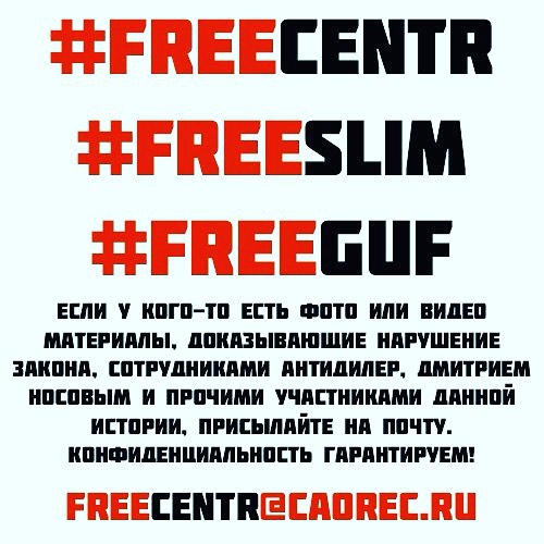 «#красноярск , если есть толковые адвокаты , просим вас помочь в ситуации с задержанием группы Слима и Гуфа . 89994418101 . Остальных просим не звонит и не писать на этот номер. Так как, там наше доверенное лицо . #freeGuf#freeSlim #freeCENTR»