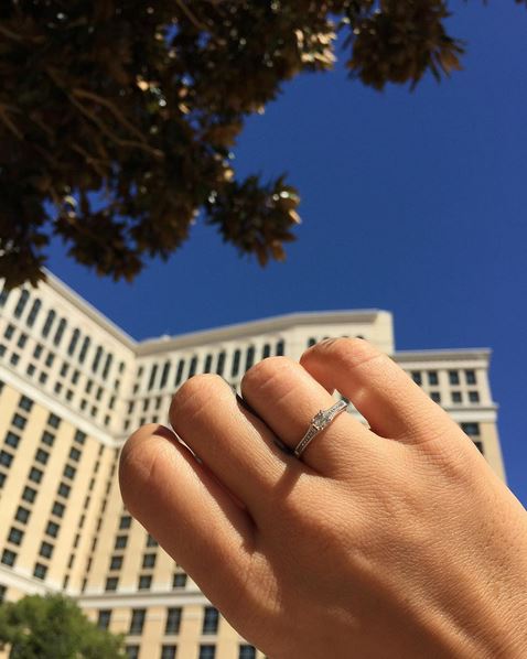 «Конечно мы планировали) вначале в шутку, а потом решили что хотим свадьбу только для нас. Чтобы весь день видеть лишь другу друга и ни на кого не отвлекаться) вначале хотели на Бали, но так как я никогда не была в Америке, Дима подарил нам такое путешествие. А вот моё кольцо, не то с которым мы в итоге поженились вчера) а то кольцо, которым он сделал мне предложение) и было это лишь вчера! Я плавала в бассейне со стариками) и тут приплывает он, а в руках вот эта красота))) я сразу начала прикалываться, ты что его нашёл или украл))) он улыбался и сделал мне предложение, надев кольцо я сказала "да", потому что кольцо было идеального размера))) а значит не нашёл»