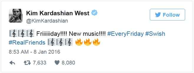 Пока Канье закрылся в студии и попросил его не отвлекать, по части анонсов отдувается его жена. У себя в твиттере Ким Кардашьян написала твит с текстом «Пятница! Новая музыка на подходе» и хештегами #КаждуюПятницу, #Swish и #ЛучшиеДрузья.
