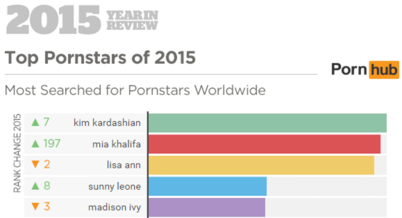 Несмотря на материнство, Ким Кардашьян стала самой популярной порнозвездой года. Оказывается, пользователи сервиса продолжают искать старый секс-тейп с Ким, который не удалось выкупить Канье. Следом за ней мусульманская актриса Миа Халифа, ставшая открытием года. А вот россияне больше всего любят Сашу Грей.