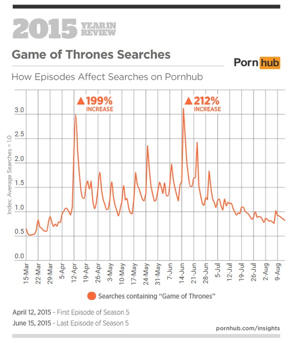 Самым забавным трендом стала связь между сериалом «Игра Престолов» и просмотром порно. Оказалось, что после выхода новой серии поисковая активность на сервисе подскакивает в 2-3 раза. Ищут ли там «мать драконов соло» или «забавы белых ходоков» сервис не уточняет.