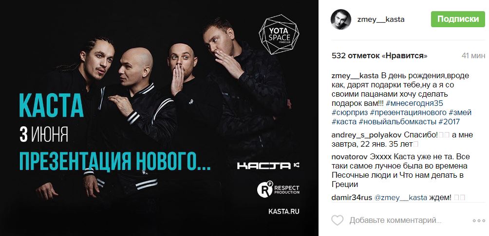 Сегодня в инстаграме Змея, которому, кстати, нынче стукнуло 35 лет, появилась фотография с интригующей подписью «Каста. 3 июня. Презентация нового...». О чём именно «новом» идёт речь, по фото непонятно, однако в хештегах значится «#новыйальбомкасты».