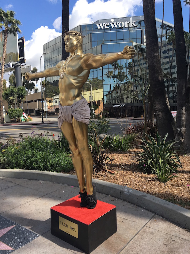 Вчера вечером в Лос-Анджелесе уличный художник по имени Plastic Jesus установил позолоченную статую Канье Уэста. И хоть крест, по всей видимости, не завезли, но и сама поза - раскинутые руки, и терновый венок на голове вкупе с набедренной повязкой недвусмысленно намекают на параллель с Иисусом.