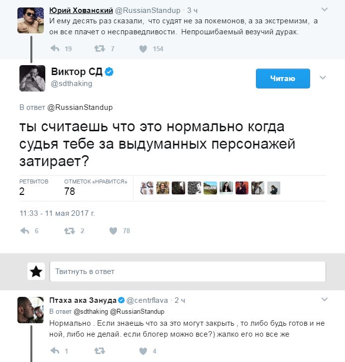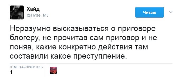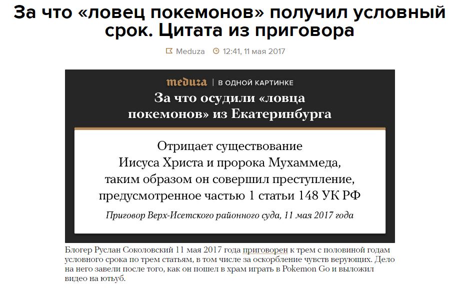 За публикацию видео, на котором он играет в игру Pokemon Go в Храме-на-Крови, сатирически комментируя происходящее, молодой человек получил три с половиной года лишения свободы условно (обвинение просило тот же срок, но с отбыванием в колонии). Основанием для обвинительного приговора стало, в том числе, отрицание Соколовским существования Иисуса Христа и вообще бога, - сообщает Медуза. Подкрепим это сообщение скриншотом:
