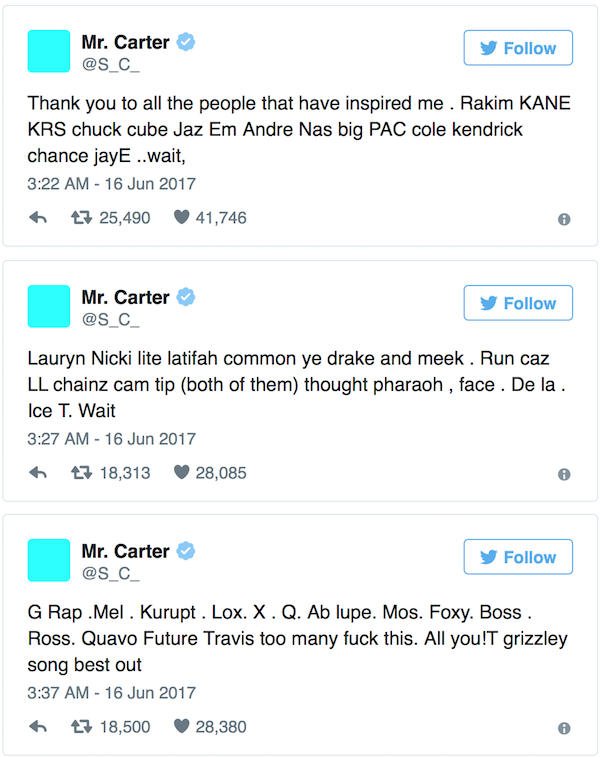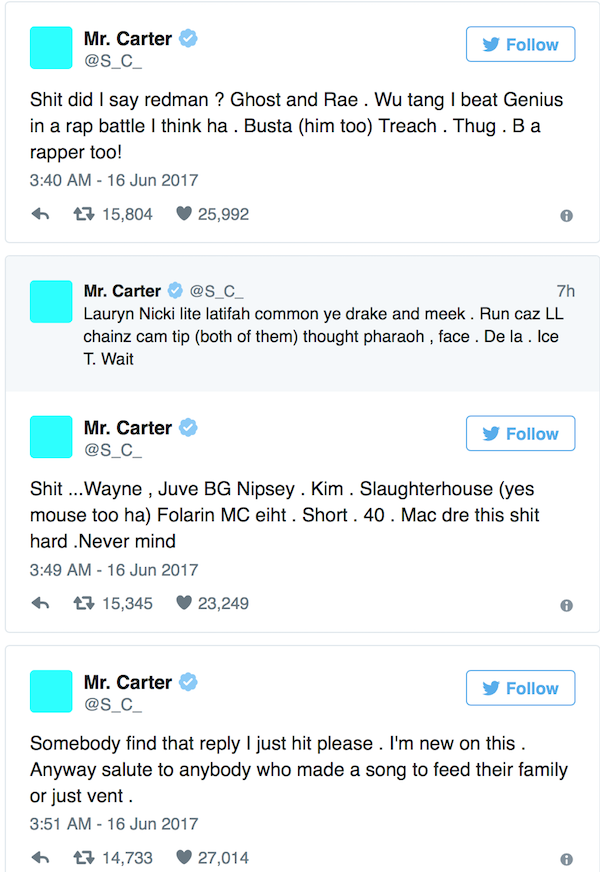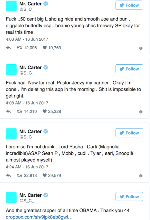 А вот лично Джей даже нарушил молчание в твиттере и, честно признавшись, что совсем не умеет им пользоваться, нелепо, но душевно поблагодарил вообще всех – от Эминема и Доктора Дре до Редмена и Канье Уэста. Серьезно, список получился действительно внушительным.