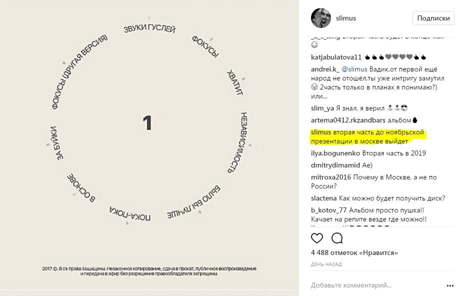 Недавно Слим в инстаграме анонсировал выход альбома на диске, который будет отпечатан ограниченным тиражом. В комментариях к этой записи музыкант сообщил слушателю, что до ноябрьской презентации в сети появится и вторая часть альбома.