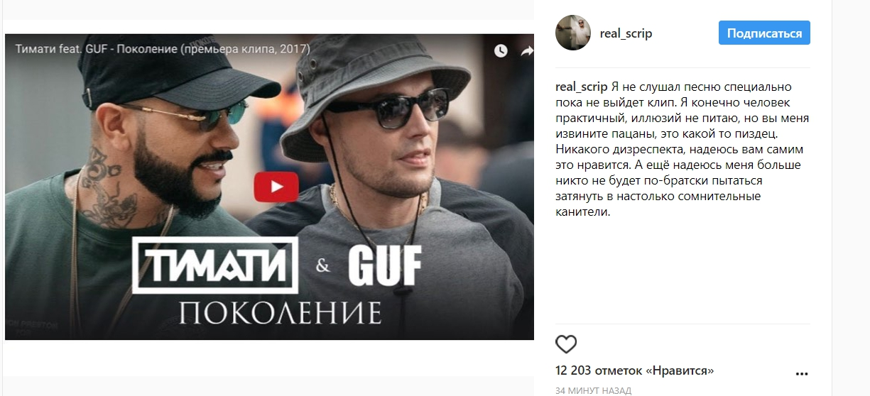 «Это какой то пи**ец»: Скриптонит о совместном клипе Тимати и Гуфа