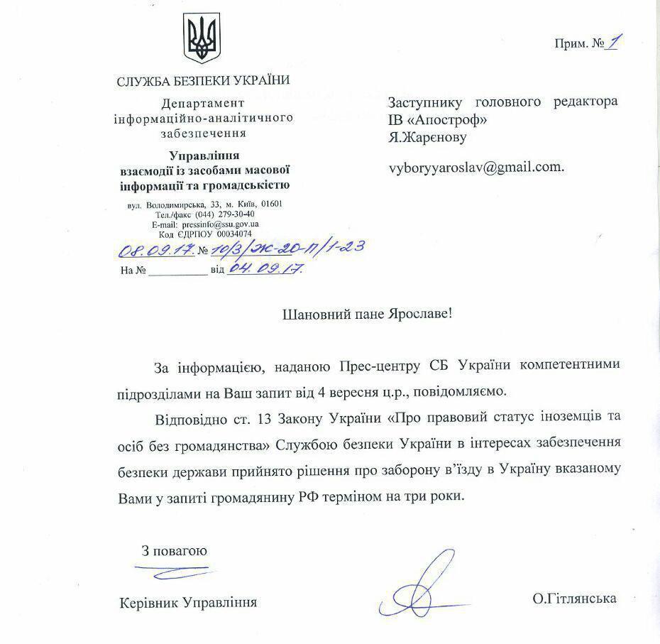 "Согласно ст.13 Закона Украины "О правовом статусе иностранцев и лиц без гражданства" Службой безопасности Украины в интересах обеспечения безопасности государства принято решение о запрете въезда в Украину указанном Вами в запросе гражданину РФ сроком на три года"