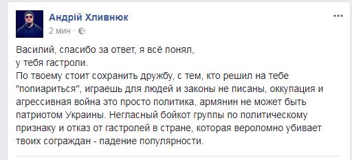 Як що це написано також i для украинцiв, то чому ж ти менi пишешь нi украiнською? Я разумiю i на мовi. На Украине у меня живёт очень много друзей и родственников. Моя бабушка родилась в Киеве, мой дедушка из Кривого Рога, моя фамилия Вакуленко – я родился в России. Моя мама родилась в Москве, мой папа родился в Белоруссии, в Волковыске. Я отвечу тебе один раз. Вероятно, твой продюсер Андрей Сагамонов толкнул тебя на ложный путь заниматься не творчеством и музыкой, а лезть в политические интрижки и грязный пиар. В творчестве тишина, тебя забывают как публичное лицо и как музыканта. И в голове твоего продюсера, настоящего патриота Украины армянского происхождения, возникает грандиозный план пиара, возрождения Бумбокса из небытия за счет моих скромных творческих успехов. Может стоит остановиться и задуматься? Взять пример с достойного человека и настоящего музыканта Святослава Вакарчука, который своим творчеством и своими достижениями доказывает, как он любит и прославляет свою Родину. Помню, как вы с Сагамоновым, сидя у меня на студии, вещали о том, что политика – это не ваше дело и музыка должна оставаться музыкой в чистом виде. Вы отказались от съёмки в клипе "Солнце не видно" с сюжетом, который был предложен и впоследствии снят нами. Вам показалось, что подобный сценарий может плохо отразиться на концертном графике группы "Бумбокс" по России, потому что Россия – единственное место, где у вас есть концерты и есть возможность зарабатывать. Я пошёл вам на встречу, не предал нашу с тобой дружбу, ценил ее. Для меня ничего не изменилось с тех пор, как мной была написана песня "Солнца не видно". Мне действительно всё равно кто, что и где решает. Политика – это не наша дорога. Мы не должны быть рупорами пропаганды. Мы должны заниматься своим делом. Меня сложно, хотя и можно упрекнуть в том, что я приезжаю на Украину зарабатывать. Но если быть циничным, вместо концертов на Украине у меня были бы концерты в других городах и странах. Прошу простить за пафос, но факты говорят сами за себя – мой график расписан до середины 2019 года. Приезжая выступать на Украину, я выступаю прежде всего для людей. Для тех, кто слушает мою музыку и понимает, о чём я говорю. Я пою для всех наших людей, которые живут по всему миру. Я ценю их и благодарю их за взаимность. Я приезжал и буду приезжать на Украину и без концертов. Я люблю свою Родину так же как ты любишь свою. Андрей, раз ты помнишь слова моих песен и не забыл о том, что мы друзья – давай хранить нашу дружбу, а не предавать ее. Настоящая дружба дороже славы, пиара и денег. Жму руку. По-прежнему искренне твой друг, Василий Вакуленко. (Обрати внимание на окончание моей фамилии)))))))))