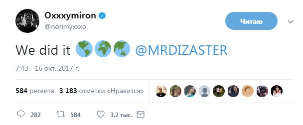 Совсем недавно закончился баттл между Дизастером и Оксимироном. Запись баттла появится в сети уже сегодня вечером — что важно, с субтитрами. Победитель не объявлялся, но коллеги Мирона в явном восторге: