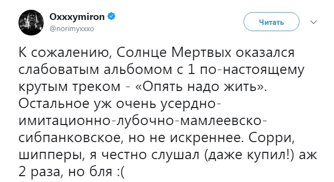 Oxxxymiron кратко отрецензировал альбом Славы КПСС «Солнце Мертвых»