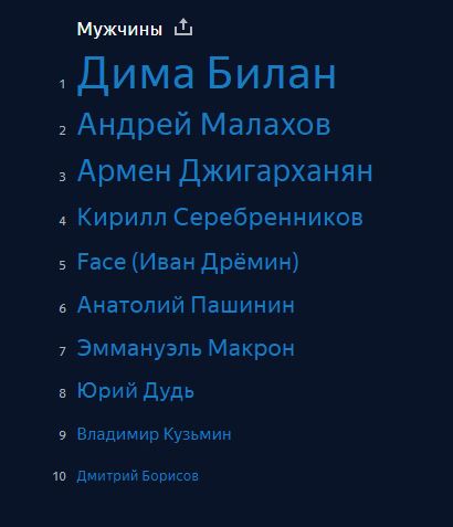 Например, в списке мужчин года нашлось место Ивану Дрёмину, более известному как Face. Иван занял 5 место, уступив Диме Билану, Андрею Малахову, Армену Джигарханяну и Кириллу Серебренникову.