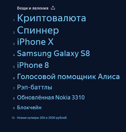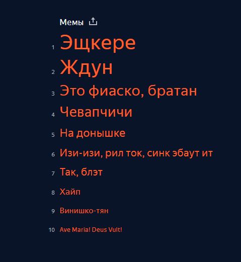 Зато в списке мемов Фэйс одержал уверенную победу — его «Эщкере» взяло первое место. Не обошлось и без других рэп-мемов: например, 6 место взял «Изи-изи, рил ток, синк эбаут ит», а слово «хайп» — 8 место. Не совсем понятно, как хайп сам по себе может быть мемом, но в целом понятно — люди пытались понять, что это такое.