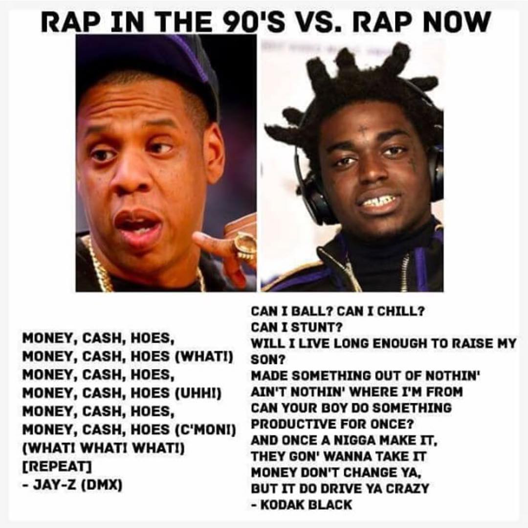 Вчера в своем инстаграме Kodak Black запостил мем, который сравнивал современный рэп и хип-хоп 90-х. Последний был выставлен не в лучшем свете благодаря удачно вырванной из контекста цитате из старой песни Jay-Z и DMX «Money, Cash, Hoes».