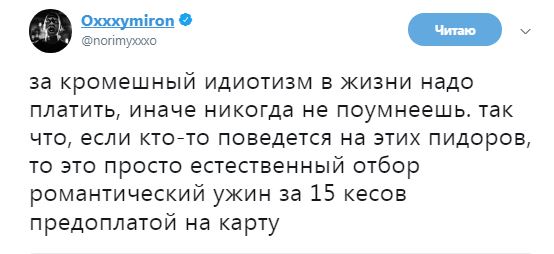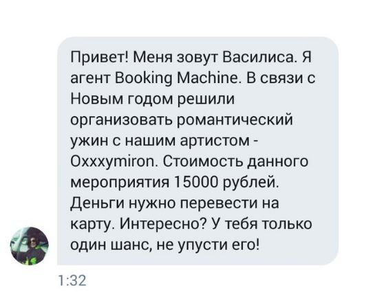 На днях некоторые фанаты Оксимирона получили странное сообщение. Некая Василиса, якобы работающая на Booking Machine, предлагала купить право на романтический ужин с Оксимироном. Стоимость этого сомнительного мероприятия оценивалась Василисой в 15 000 рублей.