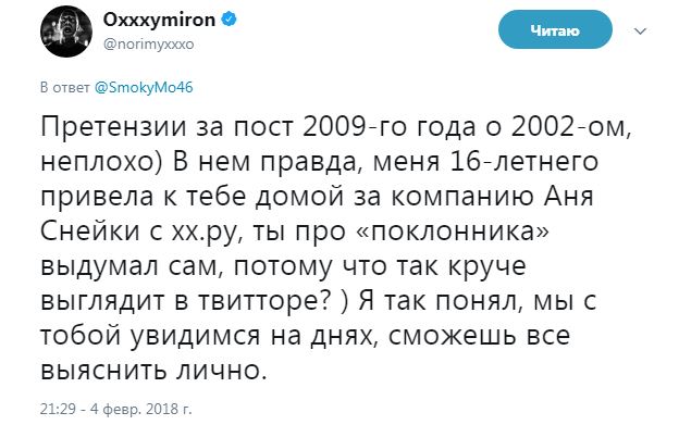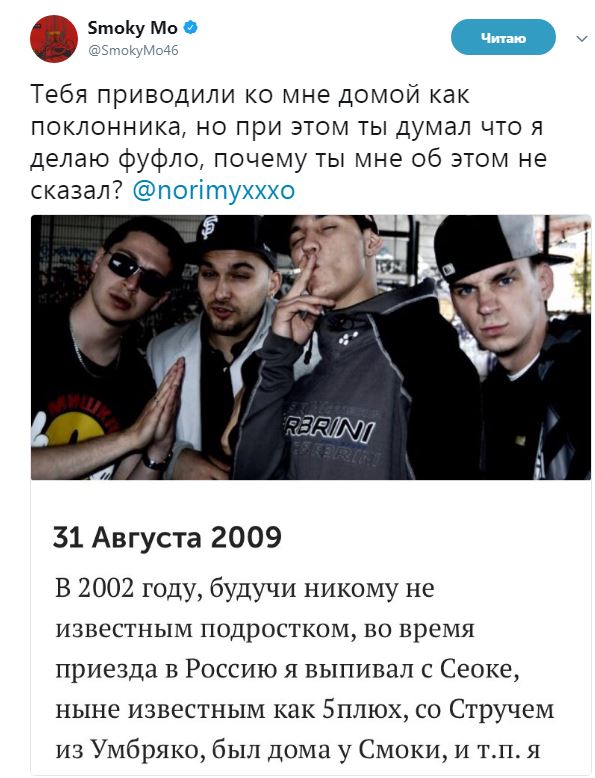 Вчера Смоки Мо опубликовал в своём твиттере старый пост Оксимирона за 2009 год, в котором тот рассказывает, как в 2002 году побывал дома у Смоки: