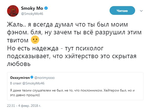 Оксимирон не стал отмалчиваться, заявив, что поклонником Смоки не являлся: