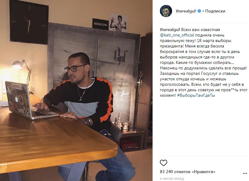 Сегодня в инстаграме Гуфа появился пост, комментарии к которому были отключены. В посте рэпер рассказывает о сервисе, который позволяет упростить процедуру голосования на президентских выборах.
