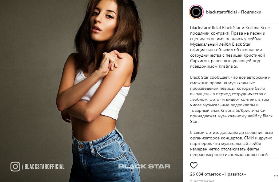 Black Star и Kristina Si не продлили контракт! Права на песни и сценическое имя остались у лейбла. Музыкальный лейбл Black Star официально объявил об окончании сотрудничества с певицей Кристиной Саркисян, ранее выступающей под псевдонимом Kristina Si.