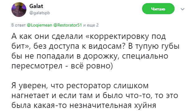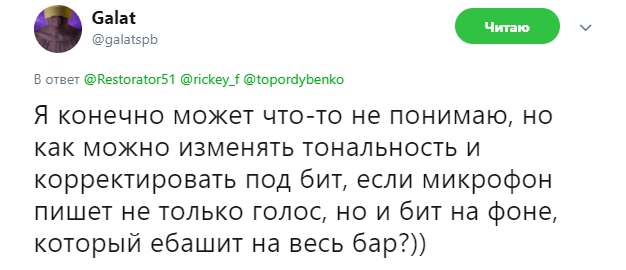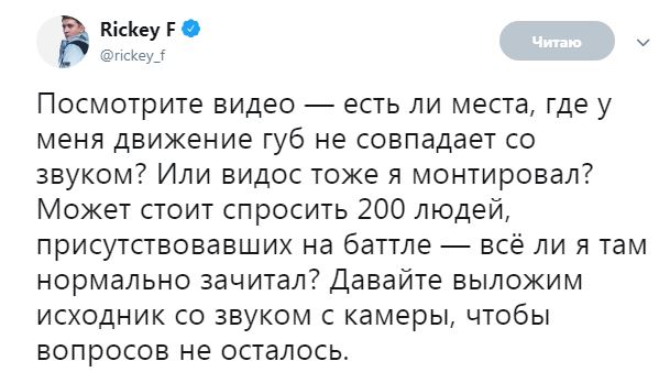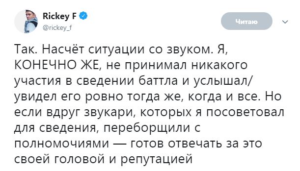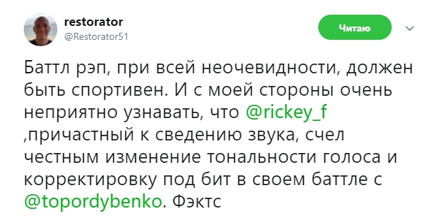 Пару часов назад в своем твиттере Ресторатор написал пост о том, что Rikcey F отвечал за сведение звука в его собственном баттле с Гарри Топором изменил тональность голоса и скорректировал его под бит в свою пользу. Согласитесь, ход не самый честный, особенно, когда оппонент и сам организатор узнают об этом после выхода баттла.