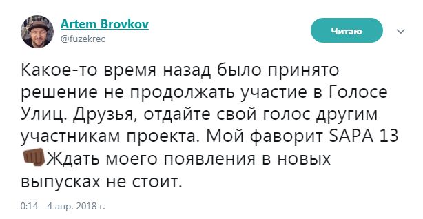 Сегодня ночью Фьюз в своём твиттере сообщил, что он принял решение не продолжать своё участие в шоу «Голос улиц» — оно, кстати, вышло на новый виток.